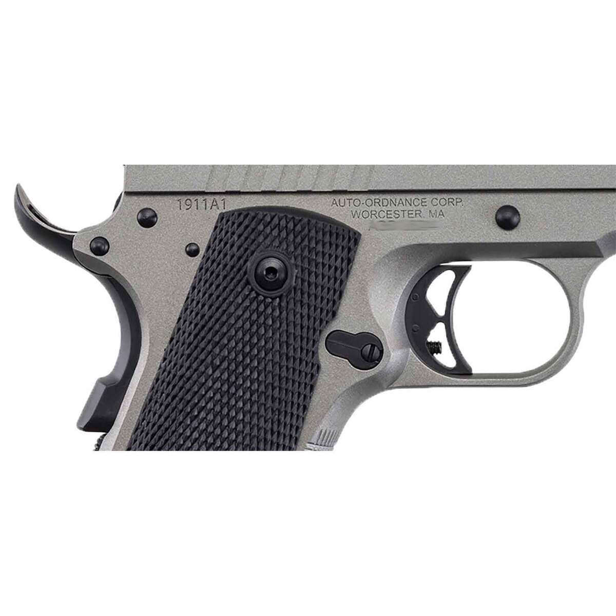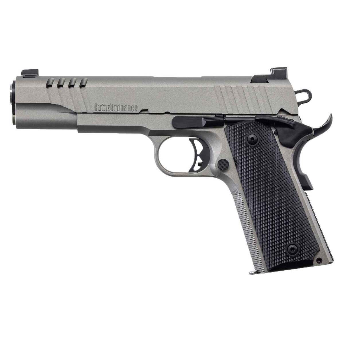 Auto Ordnance 1911-A1 45 Auto (ACP) 5in Savage Silver Cerakote Pistol – 7+1 Rounds. The Auto-Ordnance 1911BKO frame incorporates GI specs, and features a matte black finished frame, barrel, and slide. The carbon steel slide, sear, and disconnector are machined from solid bar stock, then heat treated properly to assure durability and long life over many thousands of rounds. The low-profile sights feature a blade front sight and a rear drift adjustable for windage. This model 1911 pistol is chambered in .45 ACP, has a 5in barrel, 8.5in overall length, and weighs 39 oz. The 1911BKO is 100% made in the USA, and ships with one 7-round magazine. The BKO has a thumb safety, grip safety, and firing pin block. This Auto-Ordnance 1911-A1 features a stainless steel frame and slide with a Savage Silver Cerakote. It also has black rubber grip and night sights.