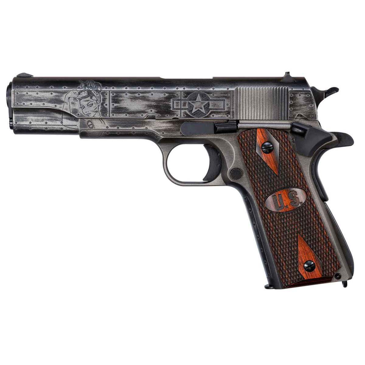 Auto Ordnance Thompson 1911A1 Victory Girls 45 Auto (ACP) 5in Gray Cerakote Pistol – 7+1 Rounds – Thompson’s special edition World War II themed “Victory Girls” 1911, is designed to honor the women whose strength drove industry at home in support of our boys fighting overseas. It starts with a 1911A1 GI model base, followed by a 5″ barrel, seven round magazine and US property logo wood grips. The slide is customized with deep cut laser engraving of a pin-up girl on the right side, and an updated Rosie the Riveter on the left. It also features the USAAC Star Roundel on both sides of the frame. The Victory Girls also features a worn look with a two color cerakote finish of armor black and gunmetal gray. This model comes chamered in 45ACP.