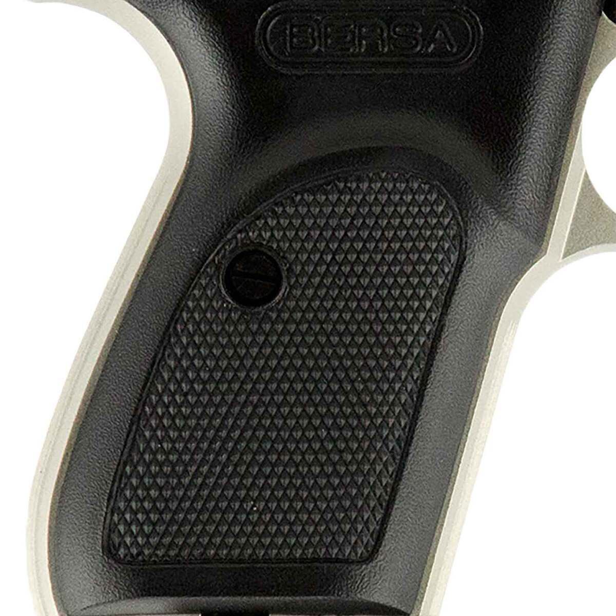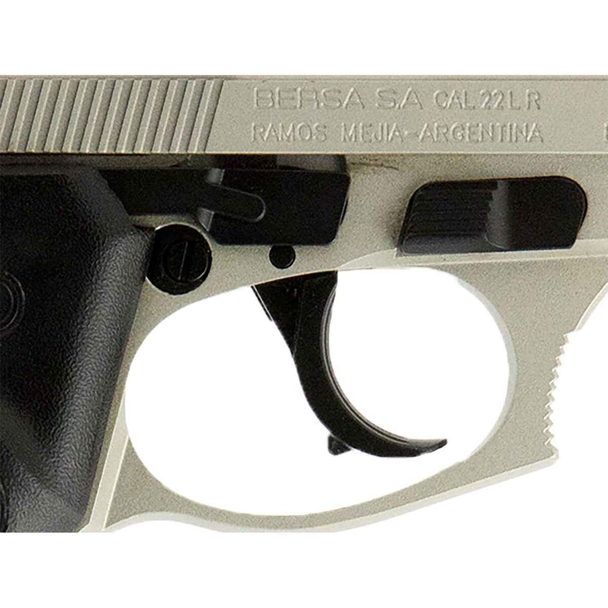 Bersa Thunder 22 Long Rifle 3.5in Satin Nickel Steel Pistol – 10+1 Rounds. With the Bersa Thunder 22, Bersa delivers a very compact, yet very capable 10+1 capacity .22 caliber semi-automatic pistol. Also, the gun has tightly packed diagonal serrations and a standard hammer. There is a decocker mounted on the back of the slide that reveals an angry red dot when the gun is ready to fire. This slide then mates to an alloy frame.The trigger guard is an upturned oval that points up toward the muzzle even as the back forms a shallow undercut behind the trigger. The front of the guard has a concave serrated surface. The grip is flanked by polymer grips. They are triangular checkered and fastened with just one flat head screw. The grip has a rounded butt mainspring housing. The 10-round magazine has a bottom finger rest thus elongating the room one gets on the grip. For safety, the Thunder 22 has an internal locking system, automatic firing pin safety, magazine safety, manual safety and the decocker lever.