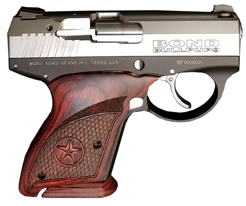 This BullPup by Bond Arms is a small double action pistol. Its solid build sports a 7075-T6 aluminum frame and a stainless steel slide, with beautiful engraved rosewood grips to give it a classy look and feel. It has 3-Dot Dovetail nonilluminated, drift adjustable sights. There is no manual safety.