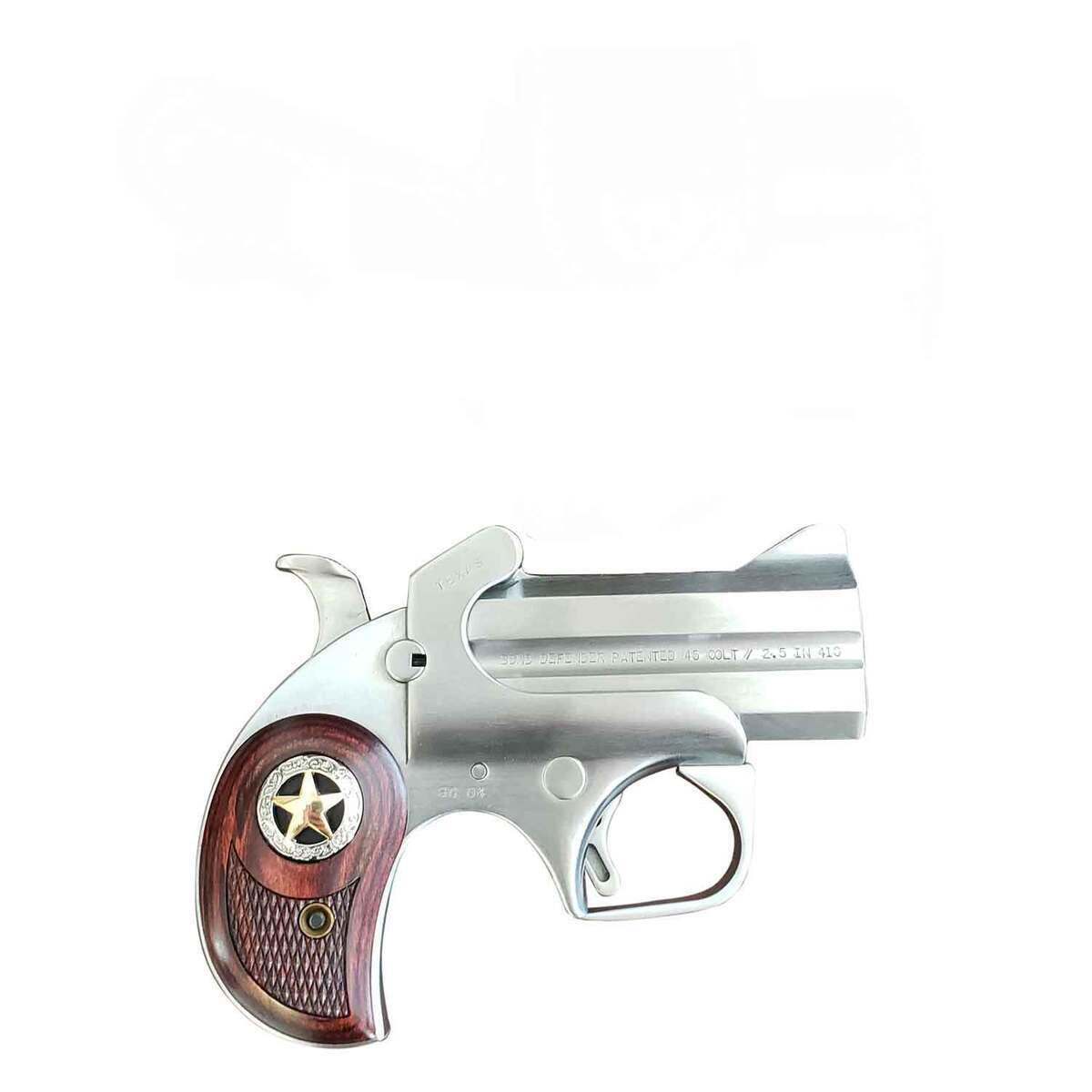 Bond Arms Rustic Defender 45 (Long) Colt 3in Stainless Break Action – 2 Rounds. The compact, yet powerful, Rustic Defender is a bold statement to a bold state. It’s built with a 3in barrel chambered for .45 Colt or 2.5 .410 shotshells and includes a matching driving holster.