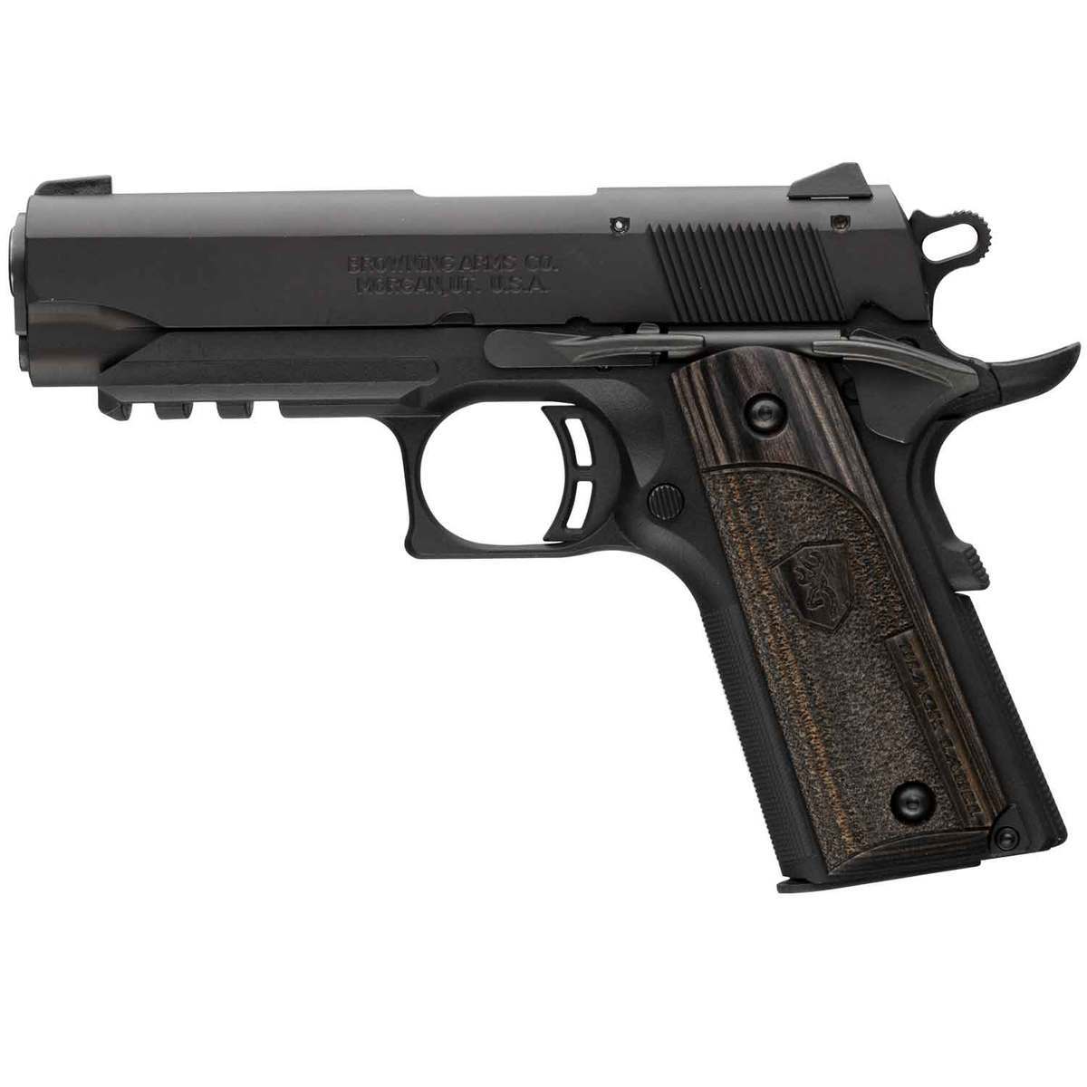 Browning 1911-22 Black Label Compact 22 Long Rifle 3.63in Matte Black Pistol – 10+1 Rounds – The Browning 1911-22 Black Label Compact is built to 85% of the original 1911 pistol in 45 ACP. Designed with a sense of duty and precision and copiously tested to ensure accuracy, function and the feel. The 1911-22 features a 1913 Picatinny rail; skeletonized trigger; black A1 front & back sights; polymer frame; extended slide release; black laminated and stippled grips. Includes one magazine and pistol case.
