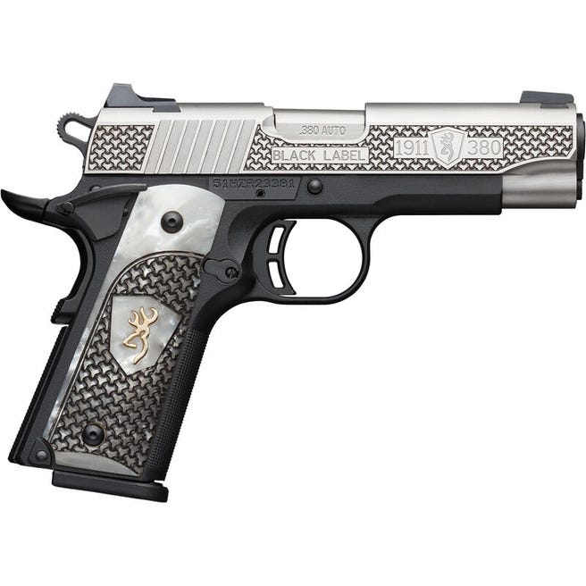 Combining two of John Moses Browning’s iconic innovations the 1911-380 Black Label High-Grade Compact is a lightweight 1911 pistol utilizing the .380 ACP cartridge. This pistol is slightly larger than most modern pocket .380’s but is sized to be your next carry gun. The .380 ACP can be a ‘snappy’ little cartridge, but in a 1911 style frame, you’ll get faster and more accurate follow-up shots. The controls operate the same as the original 1911 design with beautiful engraved synthetic white pearl grips. In traditional Browning craftsmanship, the Black Label High Grade features a machined stainless steel slide with engraved flats and a matt black polymer frame. It has a solidly constructed 7075 aluminum sub-frame with an extended slide release. The familiar safeties include an extended ambidextrous thumb safety and a beavertail grip safety. It comes with a reliable 8 round steel magazine and the magazine release is still positioned in the same comfortable location adjacent to the trigger guard. The Browning 1911-380 Black Label High-Grade Compact is the perfect choice for anyone wanting an easily concealable 1911 that shoots as good as it looks!