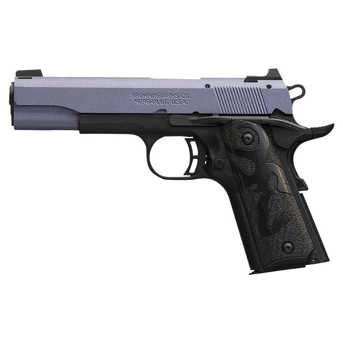 Browning 1911 Black Label 22 Long Rifle 4.25in Crushed Orchid Cerakote Pistol – 10+1 Rounds – Browning 1911-style, autoloading 22 LR pistol with Crushed Orchid Cerakote finish on the aluminum alloy slide. Metal 3-dot sights, black stippled laminated wood grips with Buckmark. Lightweight composite frame with aluminum sub-frame.