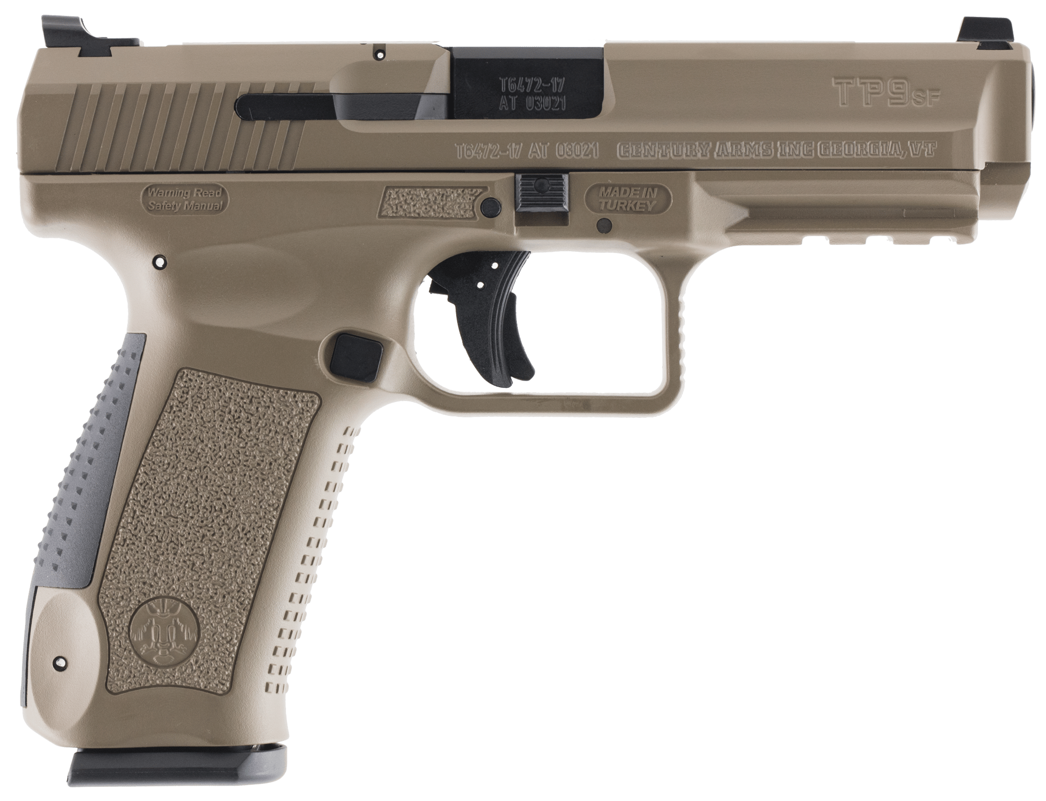COLOR Desert – CALIBER 9mm Luger – CAPACITY 18.1 rds. – BARREL 4.46 – OVERALL 7.5 – HEIGHT 5.7 – WIDTH 1.35 – WEIGHT 1.78 lbs. unloaded – Comes with industry standard dovetail sight cuts that are compatible with a large variety of aftermarket sights – Warren Tactical sights with red and green fiber optic front sight – Match grade barrel – Loaded chamber indicator – Striker status indicator – Improved single action trigger – Reversible magazine catch – Cerakote over phosphate – MIL-STD-1913 Picatinny rail – AFC magazine coating – The TP9SF comes with two mags. poly holster paddlebelt attachment interchangeable backstraps cleaning rod brush and a limited lifetime manufacturers warranty.