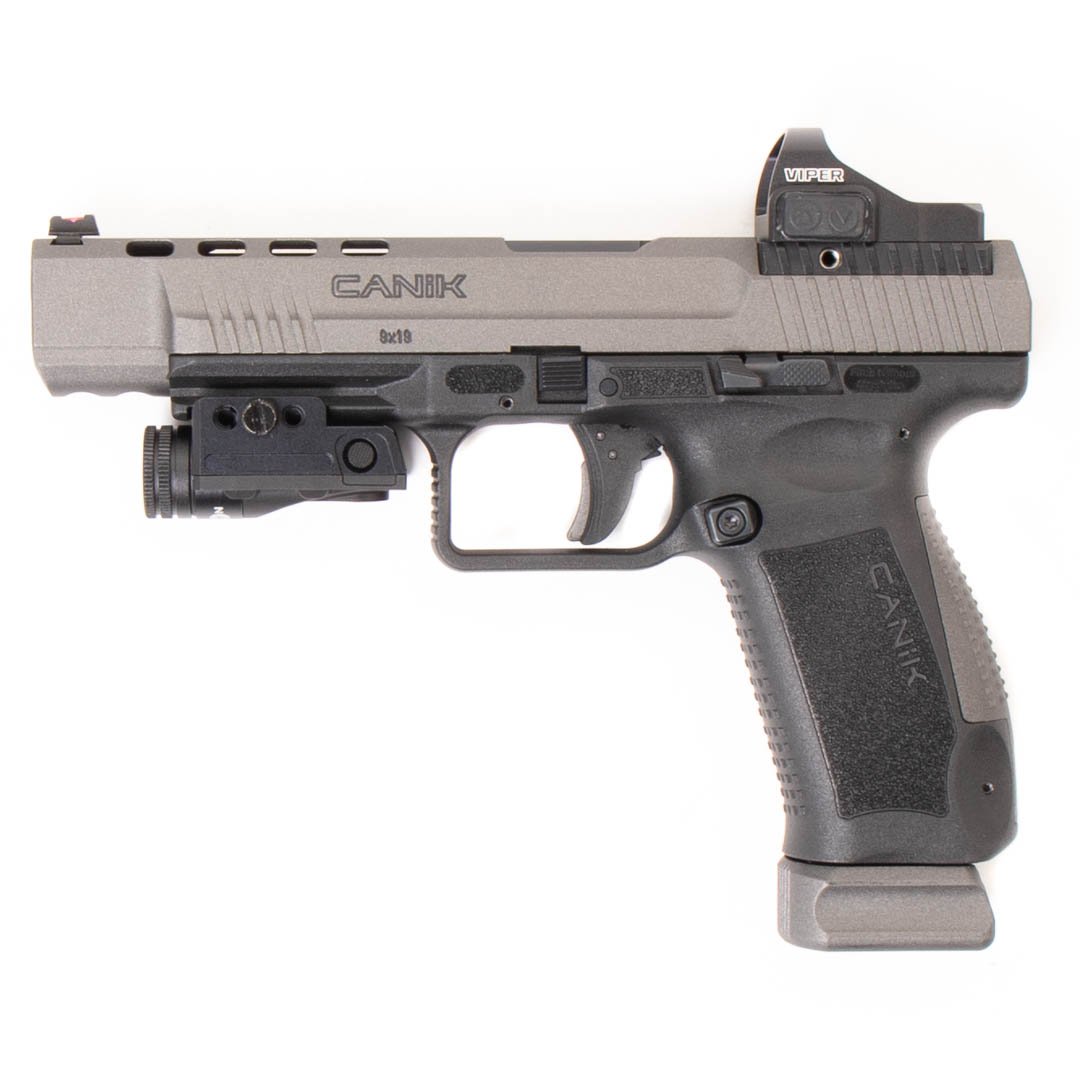 The Canik TP9SFX is a competition-ready semi-automatic pistol designed for top performance. It features a barrel length of 5.20 inches, chambered in 9mm Luger (9×19 Para) caliber, with a capacity of 18 rounds. The pistol comes in a sleek tungsten finish, weighing 1.8 lbs. It falls within the barrel length range of 5.0 – 6.9 inches and the weight range of less than 2.0 lbs.