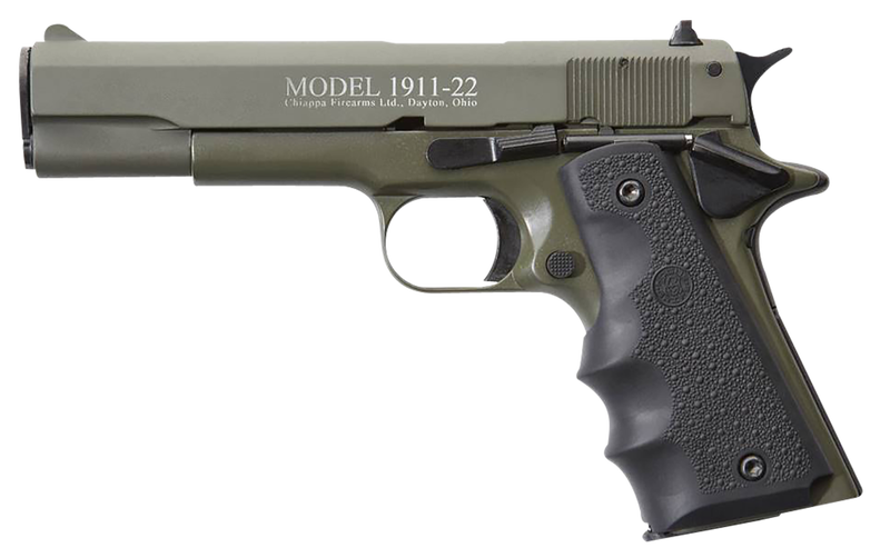 Chiappa Firearms 1911-22 version of this classic design comes with all of the features, comfort and appeal but chambered in the easy shooting inexpensive 22LR. These Chiappa handguns are the same size and have the same controls as a genuine 1911. The 1911-22 has an OD Green painted frame and slide.