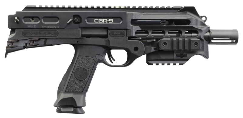 The Chiappa CBR-9 Black Rhino pistol features a semi-auto blowback system and automatic extractors. It also has a reversible cocking lever with ambidextrous mag release, safety, bolt release, and rear sling swivel. The Chiappa tactical pistol utilizes a steel receiver and polymer frame. The CBR-9 Black Rhino comes with a mag loader, carry sling, cleaning kit, and two 18-round magazines.