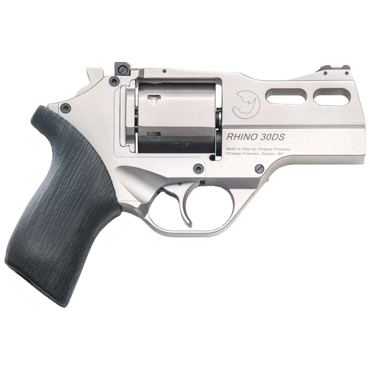 Chiappa Rhino 30SAR 357 Magnum 3in Nickel-Plated Revolver – 6 Rounds. The Rhino revolver design features a lower bore axis compared to other revolvers. This means the barrel is directly in line with the shooters hand, wrist and arm. This results in almost no muzzle rise and, because energy is better absorbed and controlled by the entire arm, it reduces the amount of recoil felt by the shooter. In addition, the alignment also gives the shooter a more natural point of aim. Shoot it and feel the difference!