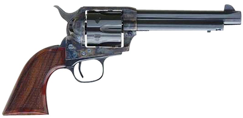 The revolver is equipped with classic blade front and notched rear sights, enhancing aim and accuracy for the shooter. The checkered walnut grips not only offer a secure hold but also contribute to the revolver’s stunning aesthetics. The cylinder and barrel are blued, complementing the color case hardened frame and creating a visually striking firearm.