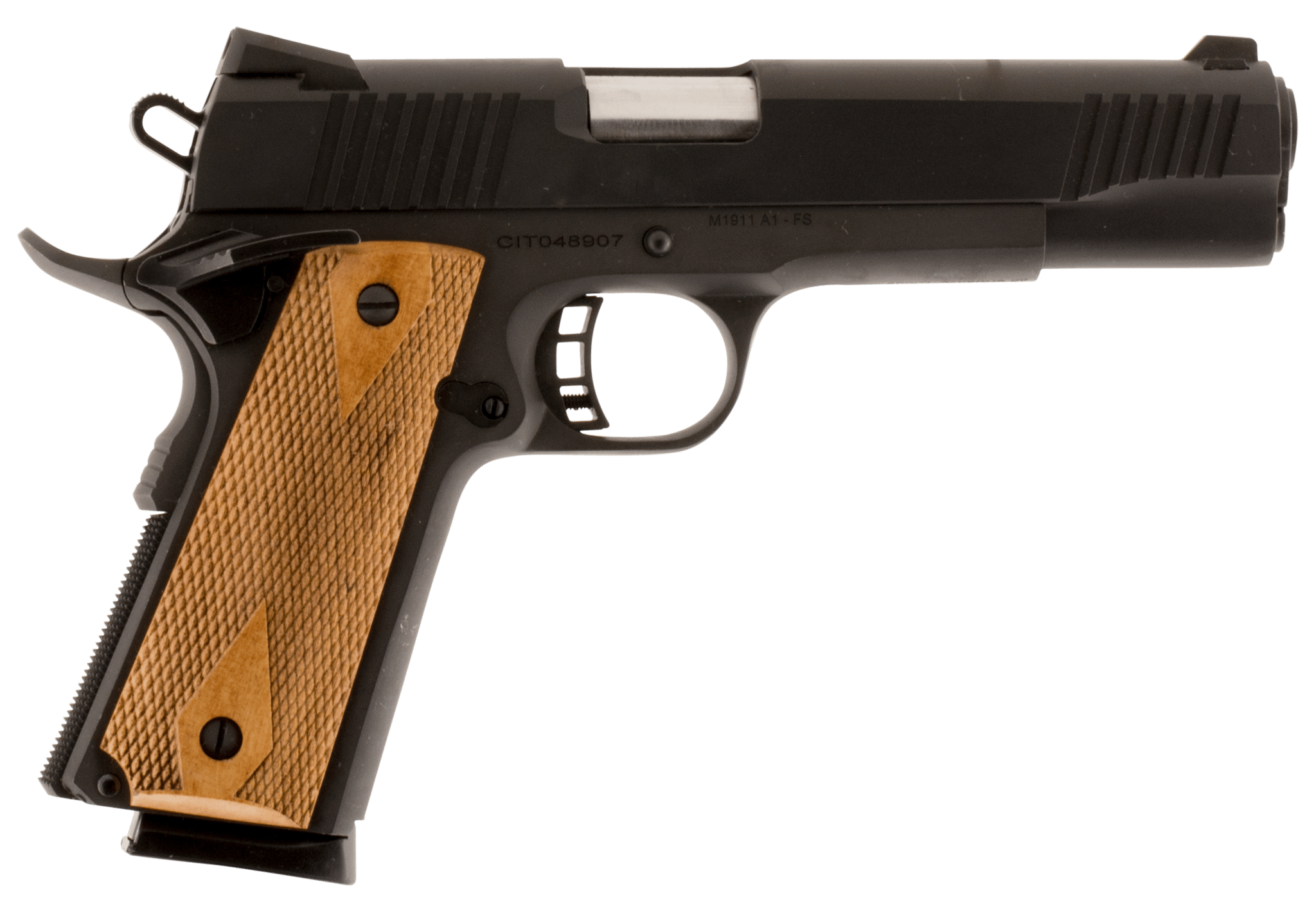 Caliber .45 ACP – Capacity 8rds – Barrel 5 – Sights Fixed – Action SA – Frame Matte Black – Slide Matte Black – Grips Wood – Length 8.87 – Weight 2.3 lbs. – Additional Features – Slide stop with grooves – Flared ejection port – Full length guide rod – Comes with (2) magazines – Skelentonized trigger – Beveled mag well – Grip safety – Extended ambidextrous thumb safety – Skelentonized hammer