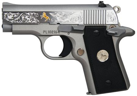 Slide engraved with scroll and gold rampant Colt. Aluminum alloy receiver, stainless steel slide and barrel are CNC machined from solid bar stock for precise tolerances. With a loaded magazine this handgun weighs less than one pound. Measures 5.5 inches long and has a 2.75-inch barrel. Minimal weight and length of the gun, combined with the short single action trigger, grip design, frame design and firing pin safety block make this firearm ideal for personal protection. High profile sights. Commander style hammer. Standard safety lock. Solid aluminum trigger. Lowered ejection port.