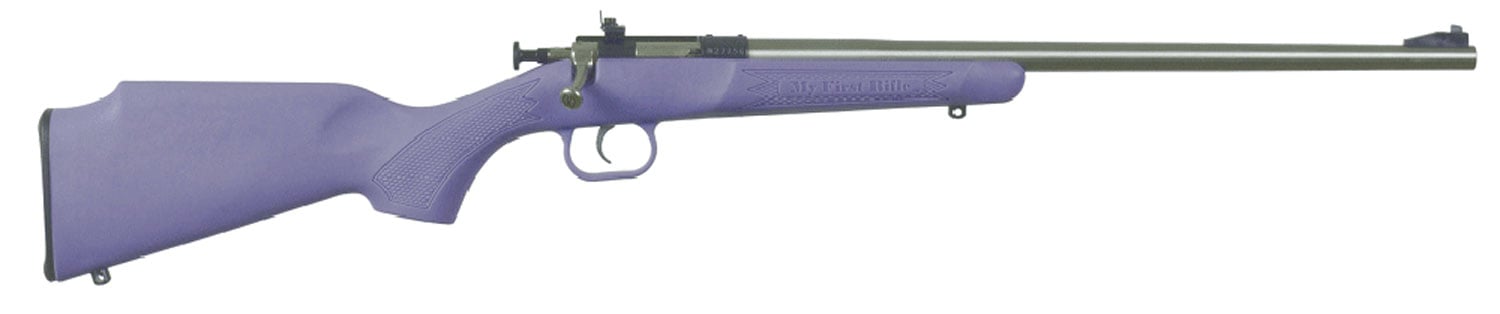 Cricketts Crickett Synthetic Rifle has a manual cocking singleshot bolt action. It features a rebounding firing pin safety adjustable rear peep sight and a fixed front synthetic stock and a drilled and tapped receiver. This model has a stainless steel barrel and a purple synthetic stock.