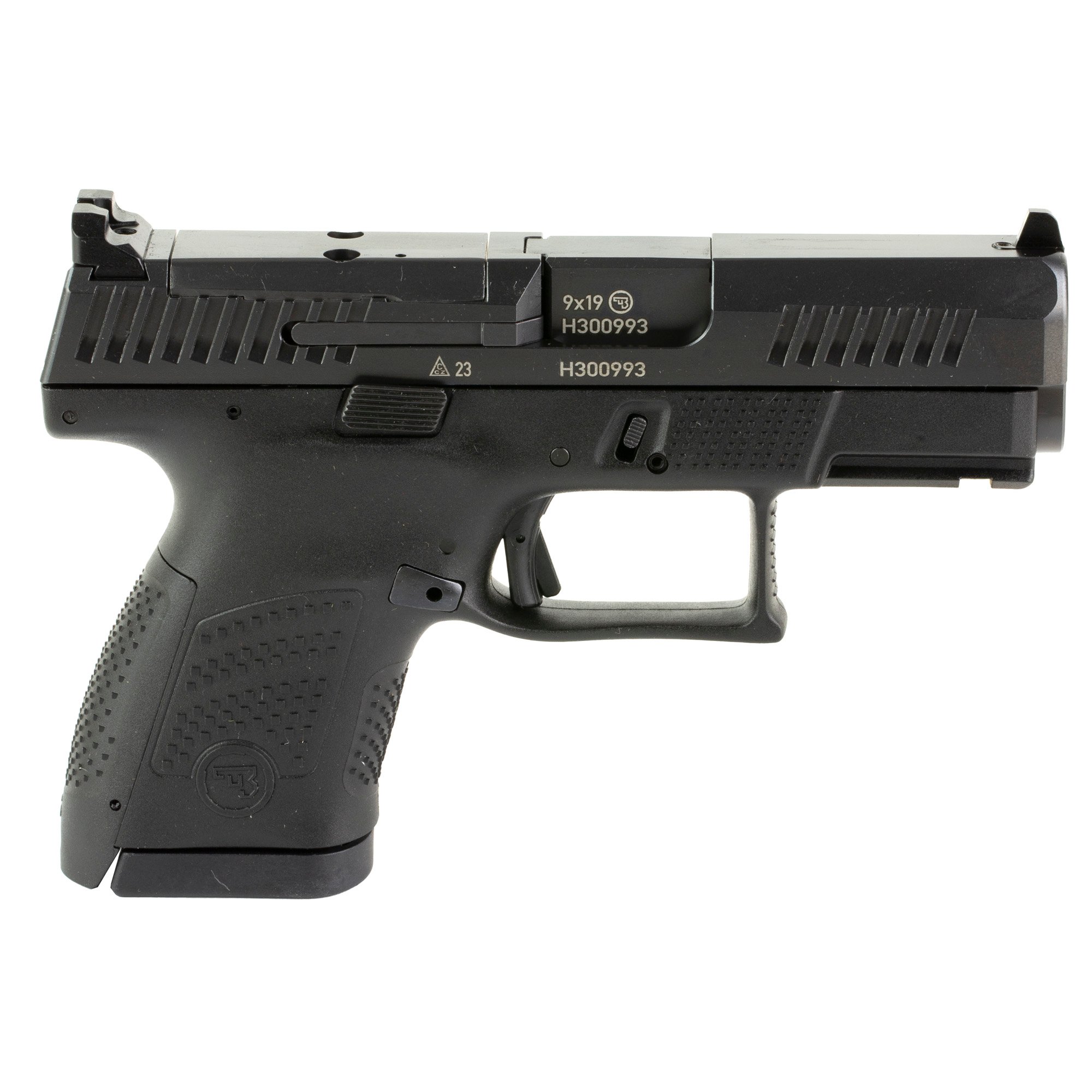 The CZ P-10S is the sub-compact variant of CZ’s popular P-10 series, featuring a striker fired action. This model has a 3.5″ barrel length and a capacity of 12 rounds of 9mm Luger (9×19 Para) ammunition. The all-black finish gives it a sleek look, and it is equipped with open notch sights. The P-10S is designed for ease of use with an adaptor plate optic mount for attaching aftermarket reflex sights. It weighs 1.52 lbs, making it lightweight and easy to carry for everyday use.