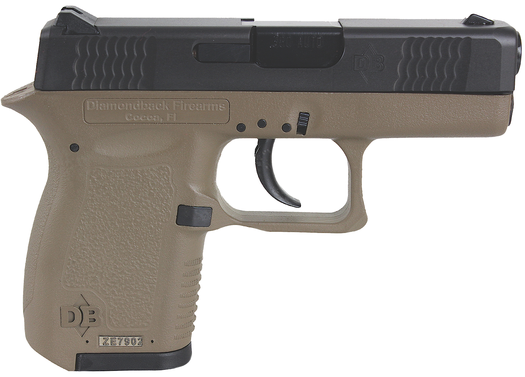 The Diamondback DB380 is a family of polymer-framed American made semi-automatic pistols chambered in 380 ACP. These micro-compact pistols have a 2.8 barrel against a 5.3 total length. An excellent concealed carry gun the DB380 features windage adjustable sights while the Finite Element Analysis slide and barrel are designed to reduce felt recoil.