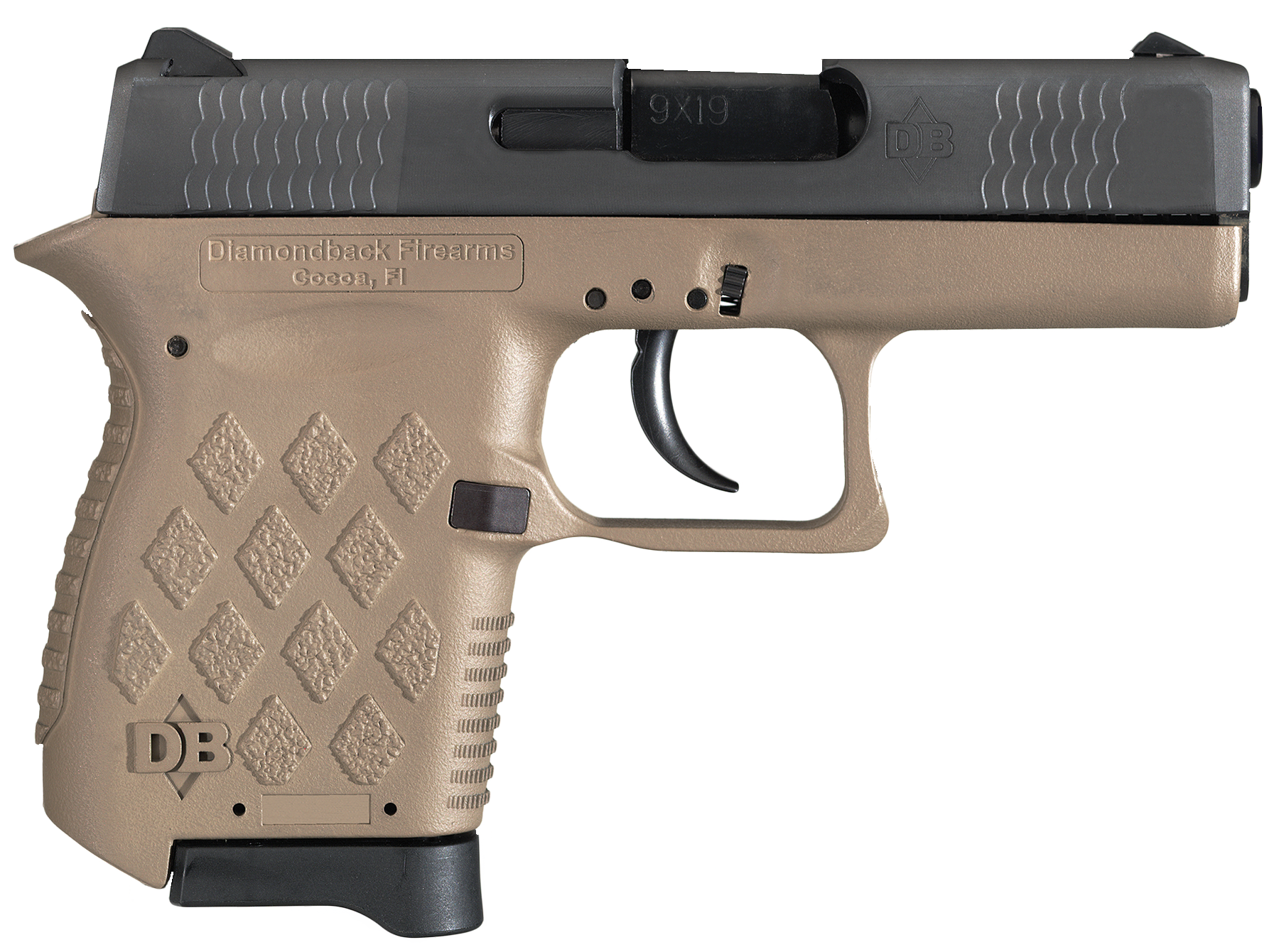 The Diamondback DB9 is an American made semi-automatic striker-fired pistol chambered in 9mm with a 6 plus 1 round capacity. This micro-compact pistol features a 3 barrel against a total length of 5.6. An excellent concealed carry gun the DB9 features windage adjustable sights while the Finite Element Analysis slide and barrel are designed to reduce felt recoil.