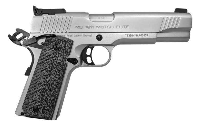 The MC1911 Match Elite is a full-size .45 ACP semi-automatic. The slide and frame both feature a matte hard-chrome finish applied over carbon steel for a combination of strength and corrosion resistance. All of the pistol’s appointments, including the sights, trigger, grip safety and magazine well, are treated with a matte-black finish.