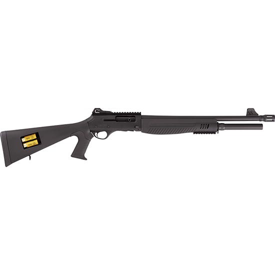 Security & law enforcement purpose 12 gauge, 3” / 76 mm chamber tactical semi automatic shotgun shotgun. Fast Loading System & Smart Valve Piston. Magazine cut-off system for single shot. Fixed cylinder choke 18” (46 cm) or 20” (51 cm) slug barrel for shot or slugs. Flash suppressor and additional muzzle cap is included. Ghost ring adjustable rear sight integrated on the picatinny rail and adjustable front sight with fiber optic sights. 2-Shotshells holder insert on stock for emergency. Flash suppressor and additional muzzle cap is included.