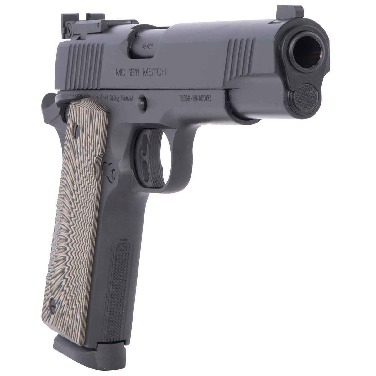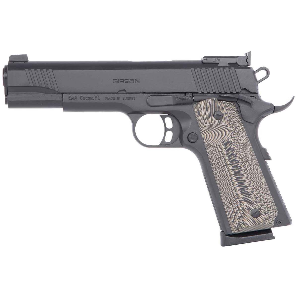 Girsan MC1911 Match 45 Auto (ACP) 5in Black Pistol – 8+1 Rounds – This model of the Girsan MC1911 Match full size version features a checkered laminated grip, ambidextrous safety, and 2.5 to 3 lbs trigger. It also features an extended beaver tail, target fully adjustable rear sight, steel machine frame and slide, and long hole hammer. It has a 8+1 capacity, and a 5in barrel.