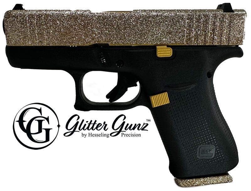 The standout feature of the Glock 43X “Midas Glitter” is its striking Midas Glitter slide finish, which adds a luxurious gold shimmer against the black frame. This unique aesthetic does not compromise the pistol’s functionality, as the serrated steel slide ensures a firm grip and easy handling. The frame is finished in a sleek black and is made from durable polymer with a beavertail design, enhancing both grip and comfort.