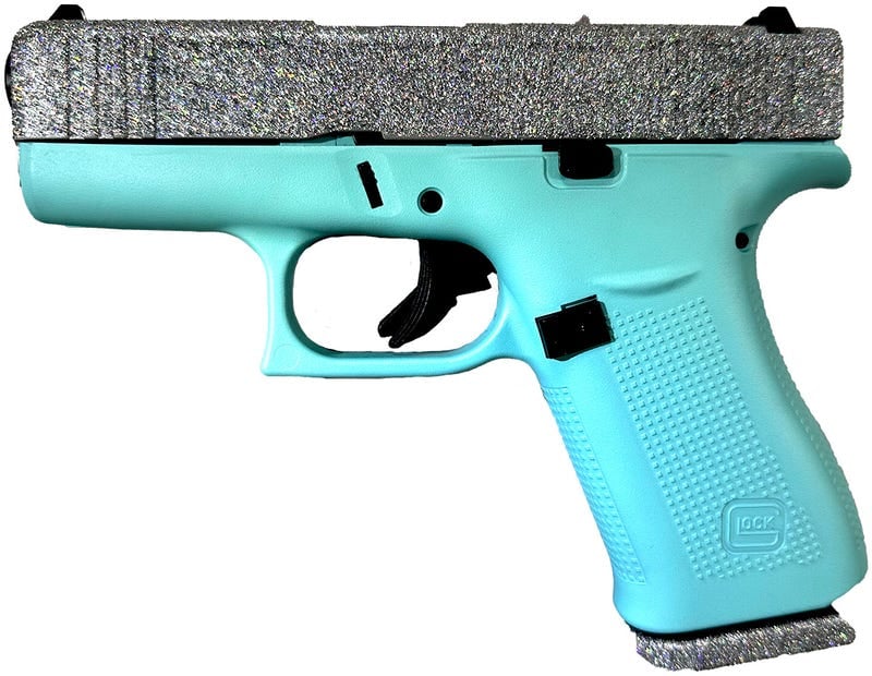 The unique “Tiffany Diamond” theme extends to the polymer frame and includes a Tiffany Blue finish with a Silver Glitter slide, making this firearm a standout piece for collectors and those who appreciate a higher level of aesthetic detail in their personal defense weapons. Despite its unique appearance, this model provides the same level of performance and dependability expected from a Glock.