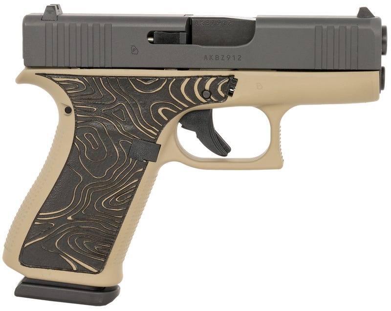 The G43X is designed with a focus on ergonomics and daily carry. Its slim profile and sub-compact frame size are complemented by the unique brown/tan textured grips with a topography design, enhancing grip stability and control. The fixed sight configuration is simple and effective for quick sighting, which is essential in a self-defense scenario.
