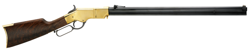 The Henry Original rifle has a classic folding ladder rear sight and blade front, traditional half-cock safety hammer notch, and no modernized manual safeties.The Henry Original Rifle is true to Henry’s 1860 patterns and patents, and virtually identical aside from concessions necessary to adapt to the 45 Colt centerfire rounds. This Lever Toggle Link Action rifle features a polished, hardened brass receiver with the same tensile strength as steel. It is fitted with a one-piece octagonal blued steel barrel and magazine. Its fancy-grade American Walnut stock has a brass buttplate. The Henry Original rifle has a classic folding ladder rear sight and blade front, traditional half-cock safety hammer notch, and no modernized manual safeties.