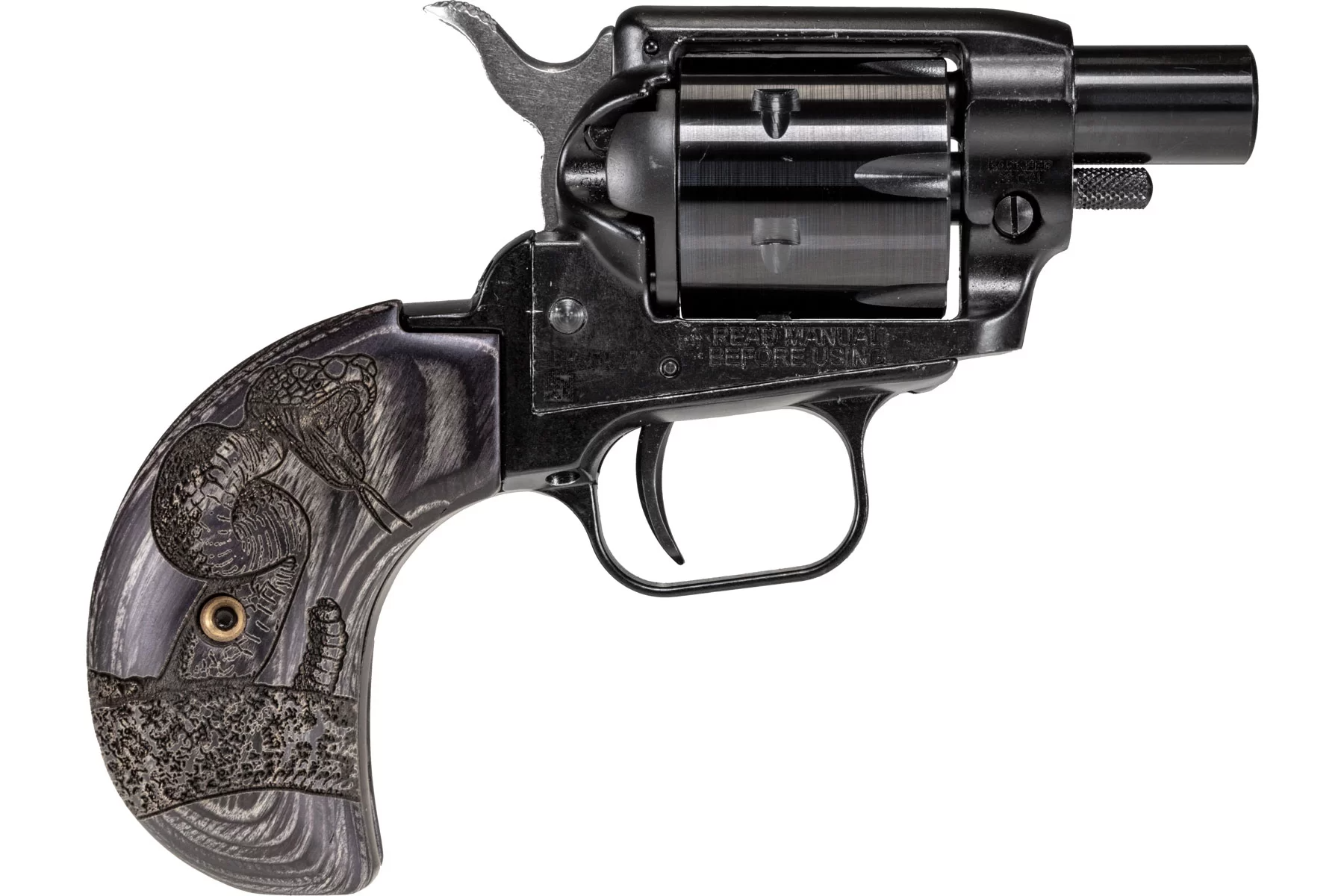 This model is offered with custom wood burnt snake grips. All revolvers come with a custom Heritage wood-handled ejector rod for removing empty cartridge cases.