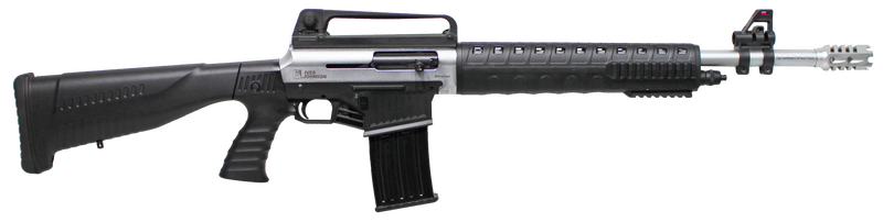The Stryker SN is an AR-15 style semi-automatic shotgun. This model features a two-tone design with a satin nickel finish and black stock/forend. The Stryker SN comes equipped with a detachable A2 Carry handle and a fiber optic front sight. The synthetic fixed stock can be removed to accommodate those who do not want to shoulder the firearm.