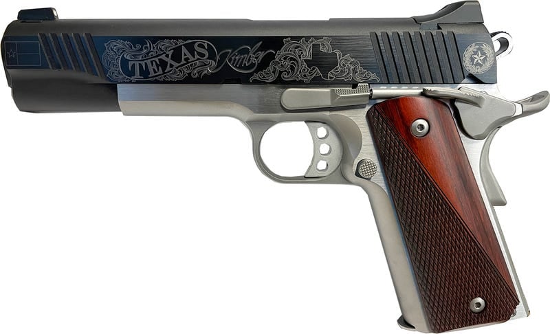 The Kimber Custom II handgun is a fantastic choice for any marksman and this one looks even better with the custom “Texas” engraving. This is a limited production GrabAGun Exclusive. Scroll work and “Texas”, the lone star state seal the shape of the State of Texas and of course the Texas Flag are custom engraved on the slide.