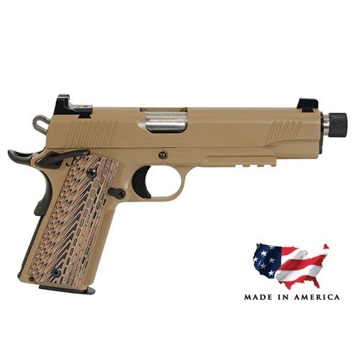 This model comes with Tritium night sights, enhancing accuracy in low-light conditions, a crucial feature for tactical situations. The G-10 Tan/Black grips not only provide a unique aesthetic but also ensure a secure and comfortable hold, improving control and accuracy during use.