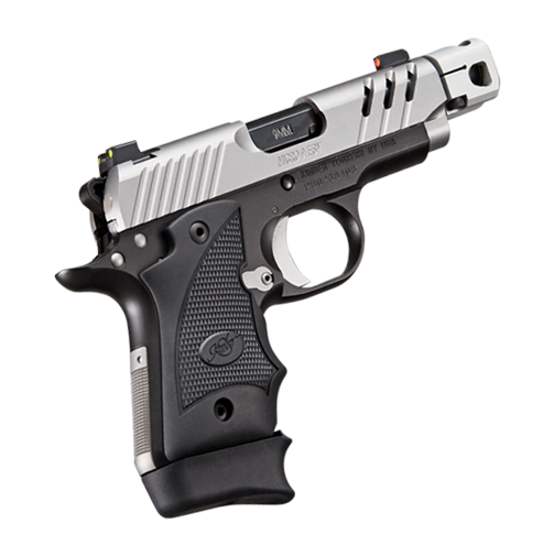 The Micro 9 ESV Two-Tone has a mini-compensator, ball mill cocking serrations, a Hogue Black Rubber Wraparound grips, and Truglo Tritium Pro Night Sights – orange front sight ring, u-notch rear sight with cocking ledge and chartreuse sight rings.