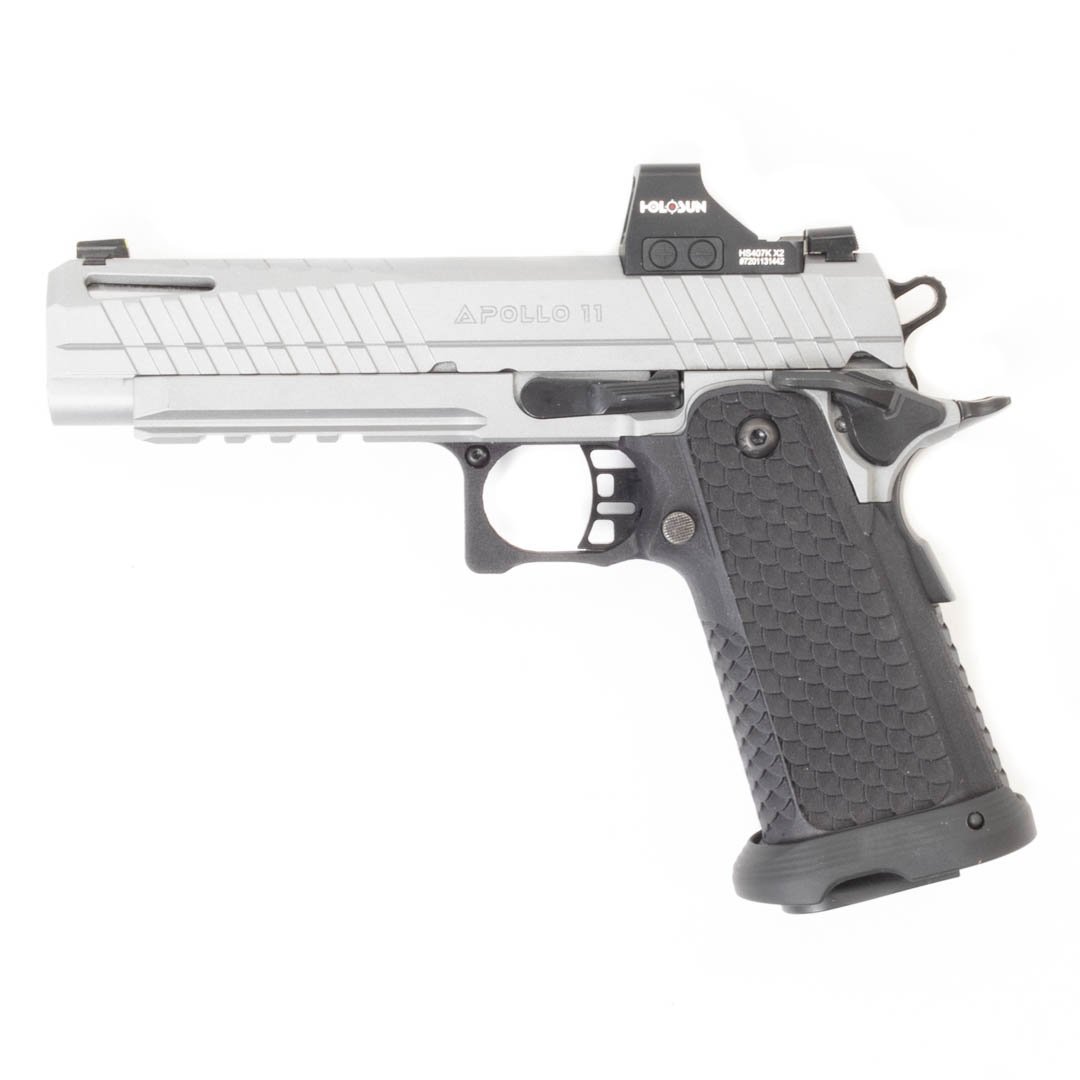 Introducing the cutting-edge Apollo 11 9mm Pistol, a marvel of firearm engineering that seamlessly blends timeless design with modern innovation to deliver unmatched performance and reliability. Crafted with precision and attention to detail, this pistol is the embodiment of form and function. The Apollo 11 pistol boasts a sleek and elegant profile, with a heat treated 416 stainless steel slide, 4140 steel frame that exudes sophistication. Its streamlined frame not only looks stunning but also ensures excellent ergonomics for a comfortable grip and easy handling. This pistol offers a double-stack magazine design, allowing for an impressive capacity of up to 17+1 rounds of 9mm ammunition. Whether for self-defense, competitive shooting, or target practice, you’ll have ample firepower at your disposal. The heart of the Apollo 11 pistol lies in its meticulously engineered components. Its match-grade barrel guarantees exceptional accuracy, while the finely tuned trigger system provides a crisp, consistent break for precise shot placement.