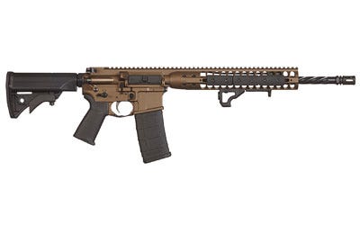 The LWRC Direct Impingement rifle showcases a 16.1″ cold hammer forged spiral fluted barrel, with a 1:7 twist rate for optimal bullet stabilization. The burnt bronze finish enhances the gun’s durability and adds an attractive touch.