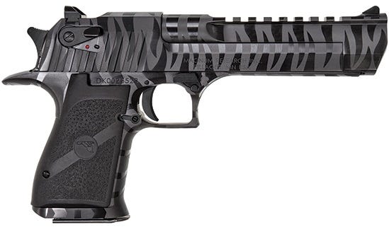 The Mark XIX Desert Eagle is a gas-operated, semi-automatic pistol with a 7 round capacity in .50 AE and 8 round capacity in 44 Magnum. The gun measures 10.75” in length with a 6” barrel, or 14.75” in a 10” barrel available in black as an aftermarket item. Width is 1.25”, height 6.25” and the weight with an empty magazine is approximately 72 ounces. It has a trigger reach of 2.75” and a sight radius of 8.5” with the 6” barrel. The construction of the Mark XIX Desert Eagle utilizes the latest CNC machine technology providing exacting specifications with tight tolerances creating a work of art in a precision firearm. The grip is anatomically formed and provides an ideal hand seating angle for two-handed shooting allowing for comfortable, rapid and accurate firing. The picatinny style accessory rail easily allows for aftermarket optics and scope rings.