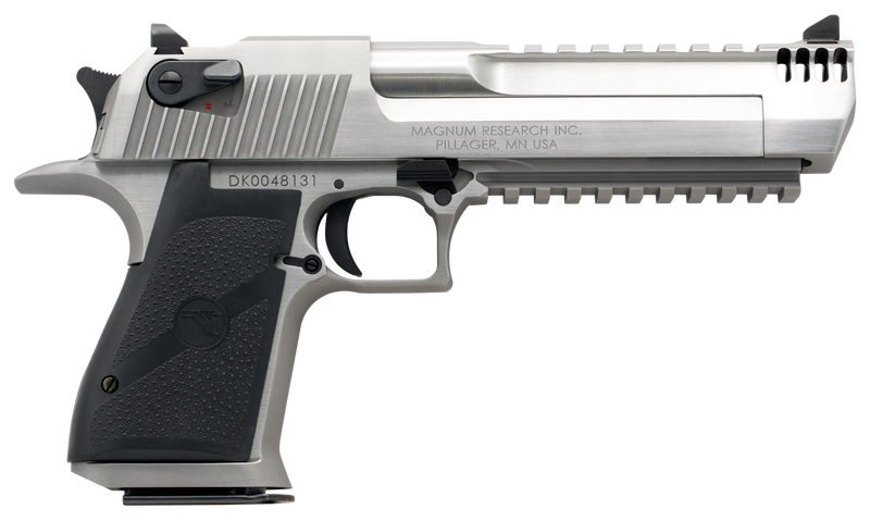 After 25 years of being accessorized, customized and re-imagined in countless movies, television shows and video games, the Magnum Research Desert Eagle Pistol has emerged as a pop-culture icon. The Magnum Research Desert Eagle Mark XIX features a full picatinny style accessory rail on the barrel from the end of the chamber to right behind the front sight and standard ambidextrous safeties. The Mark XIX Desert Eagle is a gas-operated, semi-automatic pistol with a trigger reach of 2.75″ and a sight radius of 8.5″. The construction of the Desert Eagle Mark XIX utilizes the latest CNC machine technology providing exacting specifications with tight tolerances creating a work of art in a precision firearm. The grip is anatomically formed and provides an ideal hand seating angle for two-handed shooting allowing for comfortable, rapid and accurate firing. The picatinny style accessory rail easily allows for aftermarket optics and scope rings.