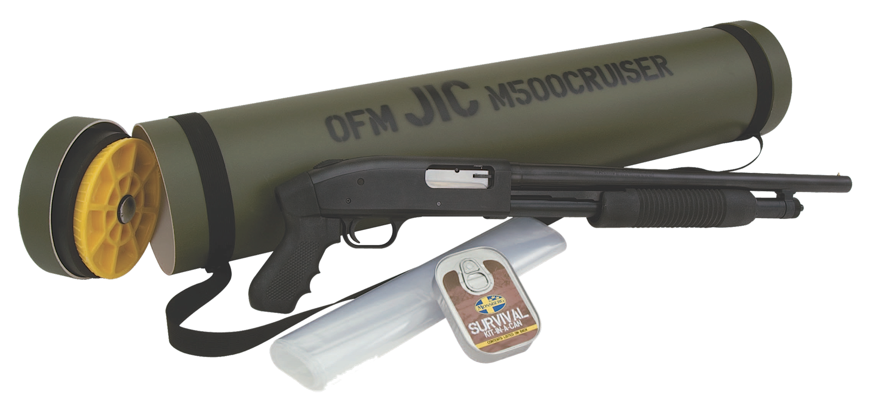 The heart of the JIC package is the venerable 12 gauge Mossberg 500 Pump-Action. Fitted with a compact 18-12 barrel and rugged synthetic pistol grip and forearm its offered in your choice of the blued Cruiser model the Mariner or the Sandstorm featuring our proprietary Marinecote finish for employment in or around harsh marine environments. Each is sealed in a re-sealable clear bag and is packaged in a heavy-duty waterproof synthetic carrying-tube complete with re-sealable top and nylon carrying strap. Youll also find convenient accessories including the waterproof Survival Kit-In-A-Can (Cruiser model) or the durable multi-tool and serrated lock-back knife combo pack with cordura case (Mariner model).