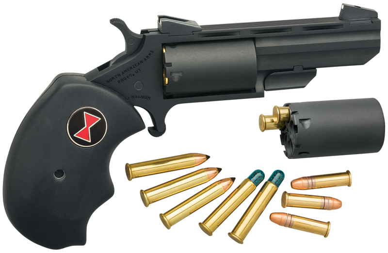 Black Widow revolvers evolved from NAA’s popular 22 Magnum frame series and include the time tested design characteristics that are incorporated in all NAA mini revolvers. The result is enhanced stability and accuracy for the shooter. The NAA Black Widow has a heavy 2″ vent barrel, bull cylinder and fixed low profile sights by Millet. The Black Widow also features oversized black rubber grips sporting the iconic red hourglass shape found on its namesake.