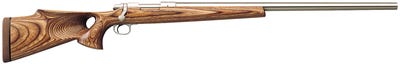 Two-tone brown pressure-laminated hardwood stock with satin finish, rollover cheekpiece with thumbhole grip, one inch brown rubber recoil pad. Length of Pull: 13 1/2 inches. Drop at Comb: 1/2 inch. Drop at Heel: 1 3/8 inches. Uncolored stainless steel metal finish. Stainless steel receiver is drilled and tapped for scope mounts. Barreled action is hand-fitted and epoxy-bedded to stock. Externally adjustable trigger from 1 1/2 to 3 1/2 pounds. Five round repeater, loadable from stripper clip. No sights. Muzzle Diameter(Nominal): 7/8 inch. Overall Length: 47 inches. Weight: 11 3/4 pounds.