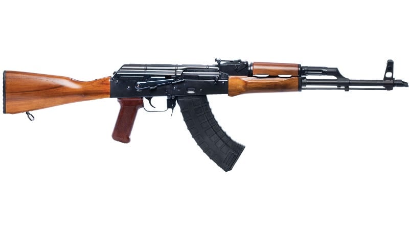 This version of the American made classical AK-47 rifle (7.62x39mm) measures 35.25″ in overall length. It features a laminate wood butt stock, upper and lower hand guards and Bakelite pistol grip. It also has a black oxide nish, heat-treated mil-spec stamped receiver 4150 Nitride Barrel, 14×1 LH thread, machined scope mount side rail, adjustable front and rear sight and a bolt hold open safety lever.