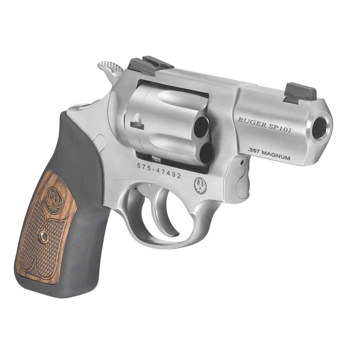 Ruger SP101 357 Magnum 2.25in Stainless Revolver – 5 Rounds – Cushioned rubber grip with hardwood insert has no exposed metal in the backstrap, making it extremely comfortable. Grip frame easily accommodates a variety of custom grips. Transfer bar mechanism provides an unparalleled measure of security against accidental discharge.