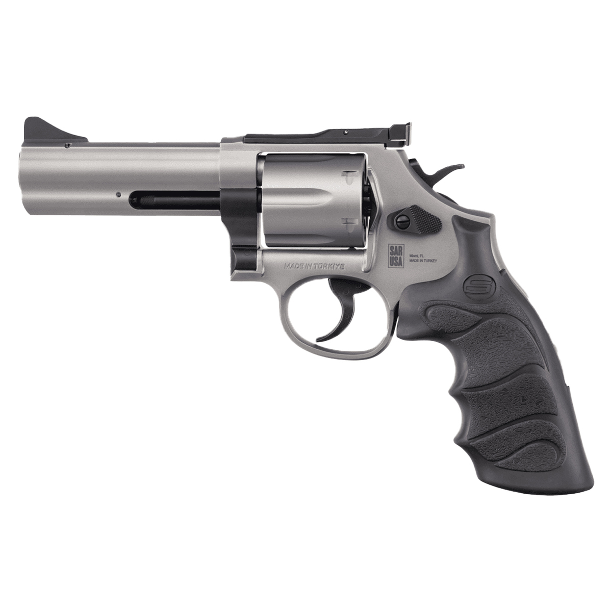 Sar USA SR38 HGR 357 Magnum 4in Stainless Revolver – 6 Rounds – The new .357 Magnum single action/double action revolvers are engineered with an excellent design and brilliant craftsmanship. They feature a 6in or 4in barrel configuration and have a tall, ramp-style, changeable front sight and an adjustable rear sight. They are six-shot, traditional, double-action trigger revolvers that have an external hammer which allows these to be cocked for crisp, single-action shots. The double-action trigger pull is consistent and catch-free; the single-action is amazingly crisp and light. The ergonomic, synthetic grip has finger grooves to improve control and handling of the revolver. It also has a unique drop safety and a hammer block; very popular among law enforcement and security personnel.