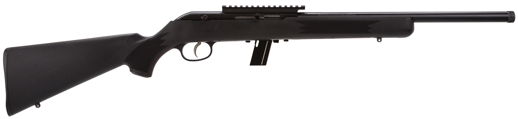 The Savage Arms 64 is a semi-automatic straight-blowback action rifle chambered in 22 LR. It features a matte black synthetic stock blued satin finish free-floating carbon steel barrel open sights and detachable box magazine. This rifle is available in a true left-handed version and is also available drilled and tapped for scope mounts.