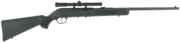 The Savage Arms 64 is a semi-automatic straight-blowback action rifle chambered in 22 LR. It features a matte black synthetic stock blued satin finish free-floating carbon steel barrel open sights and detachable box magazine. This rifle is available in a true left-handed version and is also available drilled and tapped for scope mounts.