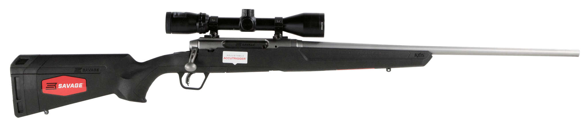 Savage Arms Axis bolt-action centerfire rifle blends affordability with unflinching performance and impressive accuracy. It sports a modern design that includes sleek contours, recoil pad vents and a textured, easy-to-control grip. It’s drilled and tapped for scope mounts and offers silky-smooth bolt operation. The Axis II XP model offers amazing out-of-the-box performance. It’s flush with features aimed at delivering tack-driving accuracy on every shot, including the user-adjustable AccuTrigger system, button-rifled barrel, silky smooth bolt action, detachable box magazine and thread-in barrel headspacing. This 30-06 Springfield model features a stainless steel 22″ barrel, black synthetic stock, and a factory-mounted, bore-sighted 3-9x40mm scope.