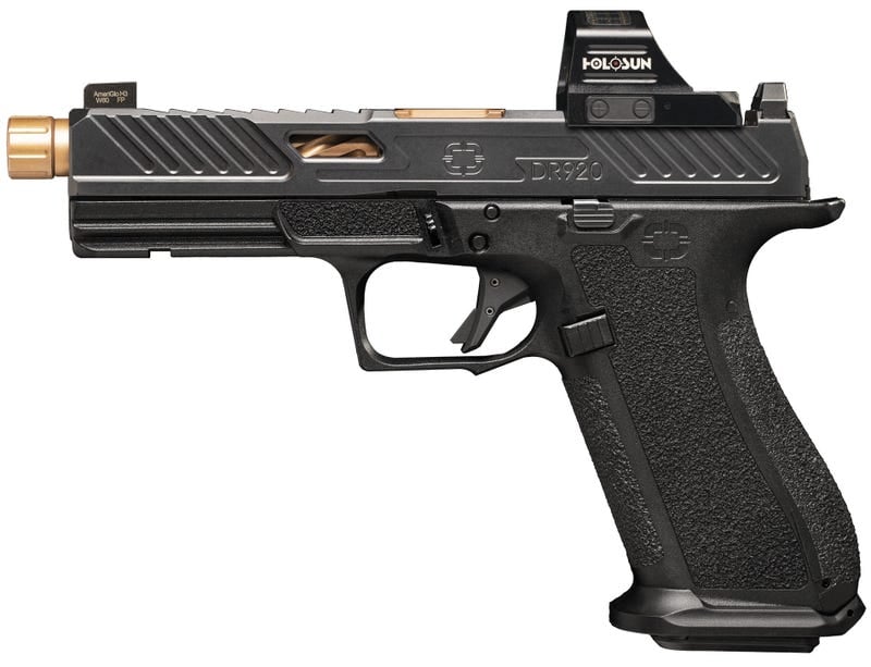 The DR920P’s front sight is mounted directly on top of the comp, for faster shot-to-shot tracking. The DR920P Elite, which fits G34 holsters, comes complete with features customers have come to expect from Shadow Systems, including an aggressively textured frame with interchangeable backstraps that adjust the point of aim, an extended beavertail, and a textured recoil control ledge. This Shadow Systems pistol comes with a factory mounted Holosun 507C.