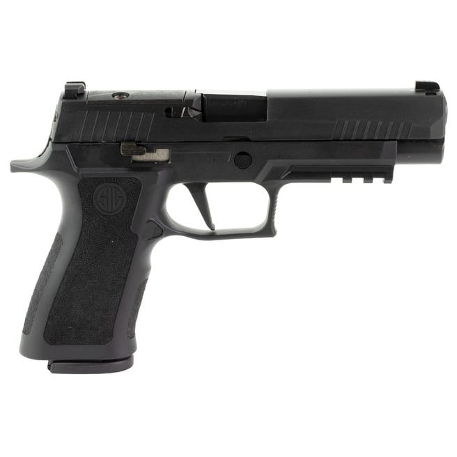 The Sig Sauer P320X is a semi-automatic pistol with a 4.7-inch barrel and is chambered in 9mm. It has Mod Poly X grips and comes with two 17-round magazines. Finished in black, this pistol comes with an optic plate cover and a rail for mounting lights and lasers.