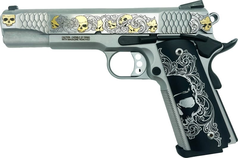 Precision. Accuracy. Performance. Smith & Wesson continues its tradition of innovation and its commitment to bringing shooters the finest quality high performance firearms. The Smith & Wesson extremely popular 1911 is now enhanced with the attractive GrabAGun Exclusive Limited Edition “Skulls” engraving. This unique 1911 will be a favorite in any collection. The slide features a skull on the front of the slide, gold inlayed Skulls and Filligree on the left, and a Gold Skull on the rear of the slide. The right side of the slide features Skulls and Filligree in gold and the grips shows a Skull and Filligree. Take advantage of the best gun deals online and get your GrabAGun Exclusive 1911 today!