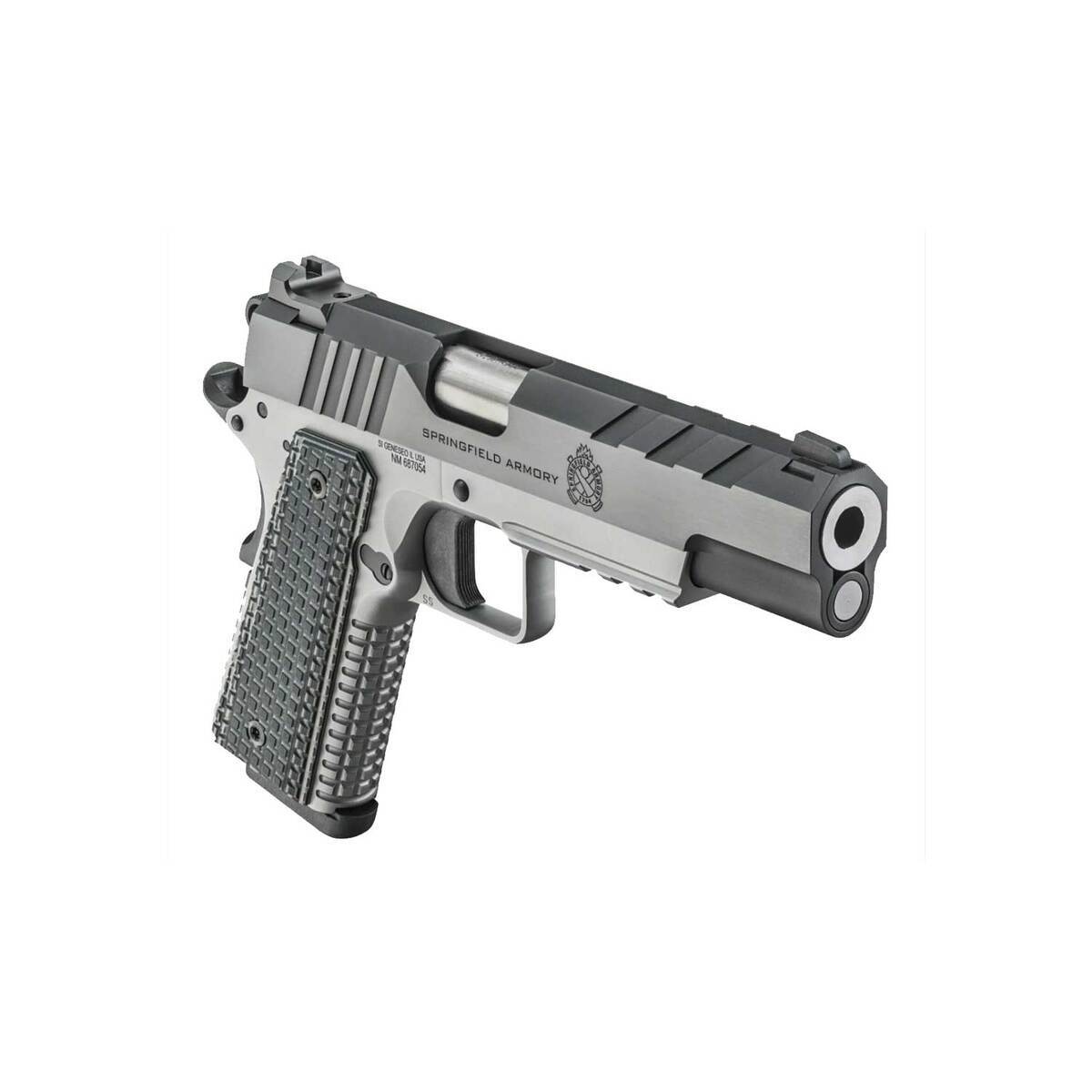 Springfield Armory 1911 Emissary 9mm 5in Stainless Pistol – 9+1 Rounds – For those who want a pistol that combines cutting-edge defensive features with custom upgrades, the Emissary 5in 9mm is a serious user’s pistol. With a Tri-Top slide featuring light-diffusing 40 line-per-inch serrations along the sighting plane and a heavy-profile forged stainless steel bull barrel, the 9mm Emissary delivers maximum accuracy. A forged hot salt blued slide and forged stainless steel frame with squared triggerguard and grenade-pattern checkering gives you a pistol ready for display or defense.