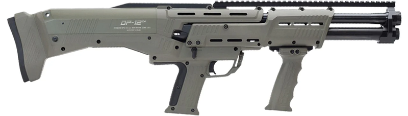 The first of its kind, a premium defense, double barreled, pump, 12 gauge shotgun that quickly fires 10 rounds. Designed for the most discerning shooters who demand extreme firepower and require consistent reliability. The stock has a QR code you can scan with your smart phone or tablet to down load the manual and other information. The spreader choke tubes are designed to shoot a devastating pattern at 25 yards. The choke tubes have Tru-Choke thread patterns. Some pictures show door breachers, these are sold separately. The DP-12 provides accessory rails and slots that allow you to customize it with your own accessories. Ergonomically designed to balance the weight of a loaded gun for quick and efficient handling with minimal recoil.
